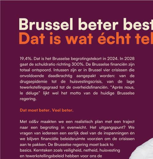 05 EDITO 06 HET GESPREK Lionel Jadot, artistieke duizendpoot en promotor van Belgisch design 12 IN BEELD Bart Dewaele 15 BEELDCOLUMN Delphine Frantzen 16 BRUSSEL KIEST Meer Brusselaars aan het werk krijgen is belangrijk voor de financiën 20 BIJGEDACHTE De goede krakers versus de slechte eigenaar: zo simpel is het niet 21 KORT GESPREK Oumoul Kairy Diallo brengt met Ras El Hanout de talen Peul en Darija naar het theater 24 BEGROTING De zoektocht naar een miljard euro 28 VOETBALCOLUMN Handtastelijkheden 29 BIG CITY Kan je Brusselse vis eten? 30 DE SLAAPKAMER van Dhriti 32 COVERSTORY Nog honderd dagen tot de Olympische Spelen in Parijs 36 COLUMN White savior complex 37 SELECT Klein onderhoud Louise van den Heuvel Eat & Drink Kitsune De vijf inzichten
