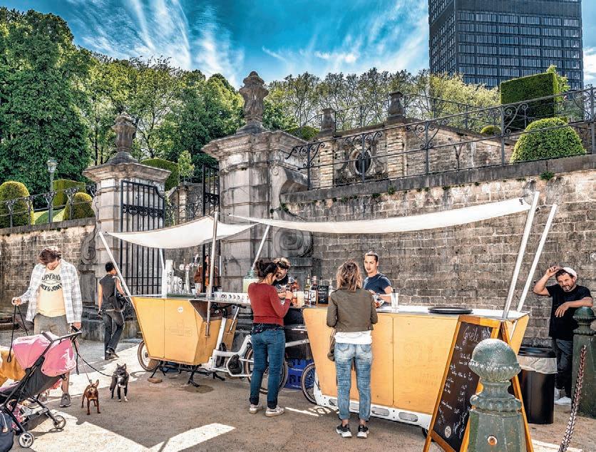 Without a doubt, Guinguette Gisèle is the most unusual. Why? Because it consists of a bicycle with a bar attached to it. This cleverly designed lightweight structure can slip into the most confined spaces. It has already been spotted in the vicinity of the Jean Massart botanical garden, and it can now be found amid the highly uneven terrain in the gardens of the La Cambre Abbey. Another from the BARC stable, Gisèle offers snacks to share that are simpler than those served in the owner’s establishments: dried sausage, organic gouda, crisps, etc. Lovers of draught beer, rest assured; the “bakfiets” has a beer cooler with La Muche, a beer specially created by Brasserie de Silly, on tap.