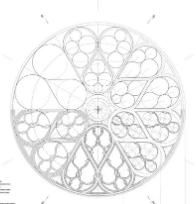 VENTANA CIRCULAR CON VIDRIERAS Y DECORACIONES EN FORMA DE ROSA.