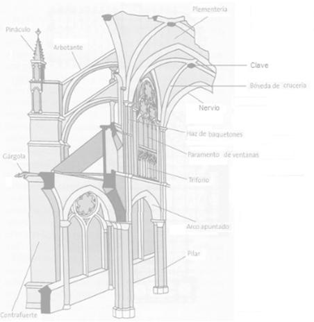 Bóvedas de cruce característica dis gótica. Estas bóvedas se forman mediante la intersección de arcos apuntados, creando una estructura en forma de cruz. Las bóvedas de crucería permiten distribuir el peso de la estructura hacia los pilares y contrafuertes, lo que permitía la construcción de edificios más altos y con espacios interiores más amplios.