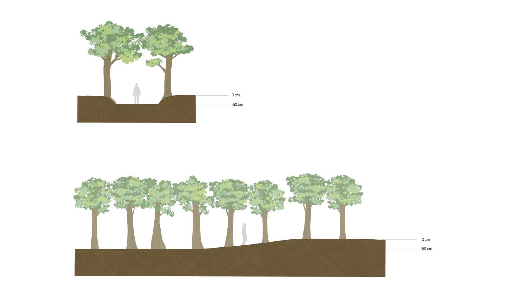 Pepohan yang begitu banyak menyambut kita saat memasuki site, pepohonan yang menjadi jalur pathway yang menciptakan kualitas seperti pada tunnel namun tidak terasa tertutup dan gelap. Pepohonan ini menjadi visual blocking untuk elemen site lainnya dan visual site dapat secara perlahan didapatkan. Ketika kita mendekati area danau adanya tanah yang meninggi secara perlahan melihat danau dan sifat reflektifnya berserta konteks site lainnya. (gambar 5 & 6)
