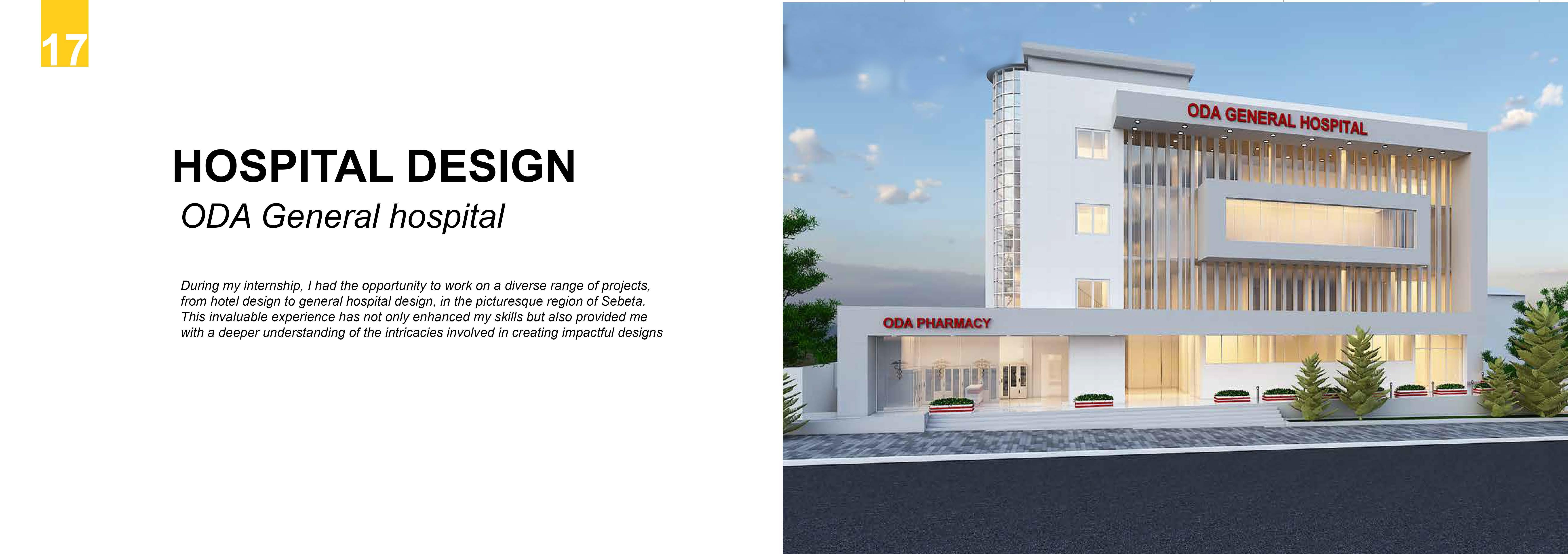 During my internship , I had the opportunity to work on a diverse range of projects, from hotel design to general hospital design , in the picturesque region of Sebeta. This invaluable experience has not only enhanced my skills but also provided me with a deeper understanding of the intricacies involved in creating impactful designs