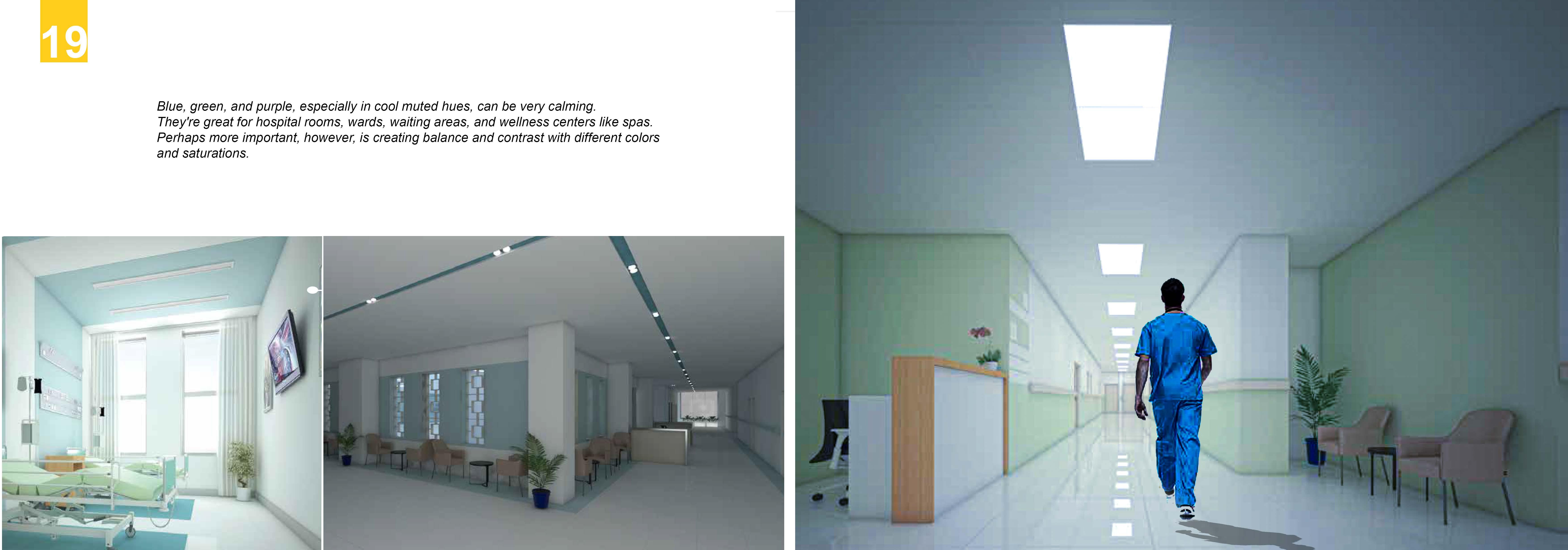 Blue , green , and purple , especially in cool muted hues, can be very calming. They're great for hospital rooms, wards, waiting areas, and wei/ness centers like spas. Perhaps more important, however, is creating balance and contrast with different colors and saturations.