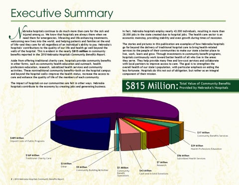 Executive Summary ebraska hospitals continue to do much more than care for the sick and injured among us. We know that hospitals are always there when we need them for emergencies, lifesaving and life-enhancing treatments, welcoming new lives into the world, and helping patients and families at the end of life—and they care for all regardless of an individual’s ability to pay. Nebraska’s hospitals’ contributions to the quality of our life and health go well beyond the walls of the hospital. This is evident in the nearly $815 million in community benefits reported in the 2010 Nebraska Hospitals Community Benefits Report. Aside from offering traditional charity care, hospitals provide community benefits in other forms, such as community health education and outreach, health professions education, research, subsidized health services and community activities. These nontraditional community benefits—both on the hospital campus and beyond the hospital walls—improve the health status, increase the access to care and enhance the quality of life of the members of each community. The impact of hospitals on our communities are felt in other ways. Nebraska hospitals contribute to the economy by creating jobs and generating business.
