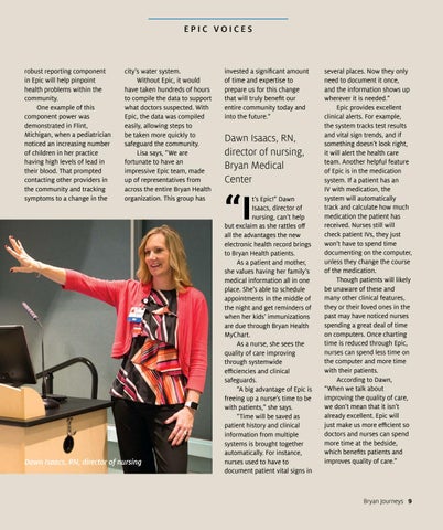 t’s Epic!” Dawn Isaacs, director of nursing, can’t help but exclaim as she rattles off all the advantages the new electronic health record brings to Bryan Health patients. As a patient and mother, she values having her family’s medical information all in one place. She’s able to schedule appointments in the middle of the night and get reminders of when her kids’ immunizations are due through Bryan Health MyChart. As a nurse, she sees the quality of care improving through systemwide efficiencies and clinical safeguards. “A big advantage of Epic is freeing up a nurse’s time to be with patients,” she says. “Time will be saved as patient history and clinical information from multiple systems is brought together automatically. For instance, nurses used to have to document patient vital signs in