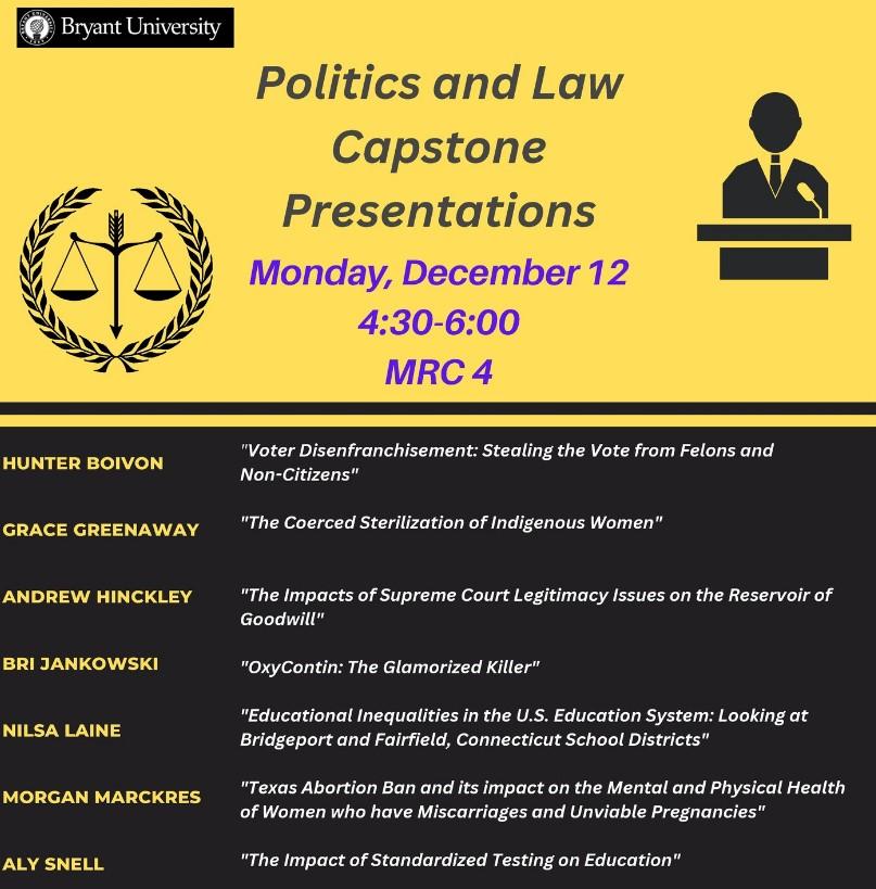 The world continues to generate challenging issues for us to study in and outside of our classrooms. The war in Ukraine has brought renewed attention to war crimes and human rights violations, so our faculty have served as expert commentators, and we are hosting a talk by a former lawyer at the UN’s international tribunals. Protests in Iran are drawing global attention and led to a discussion by six Bryant faculty with deep ties to the country, who shared their personal stories and professional insights. The midterm elections stimulated discussion of not only particular races, but of the entire electoral system with students and faculty contributing ideas in in our Talking About Politics series.