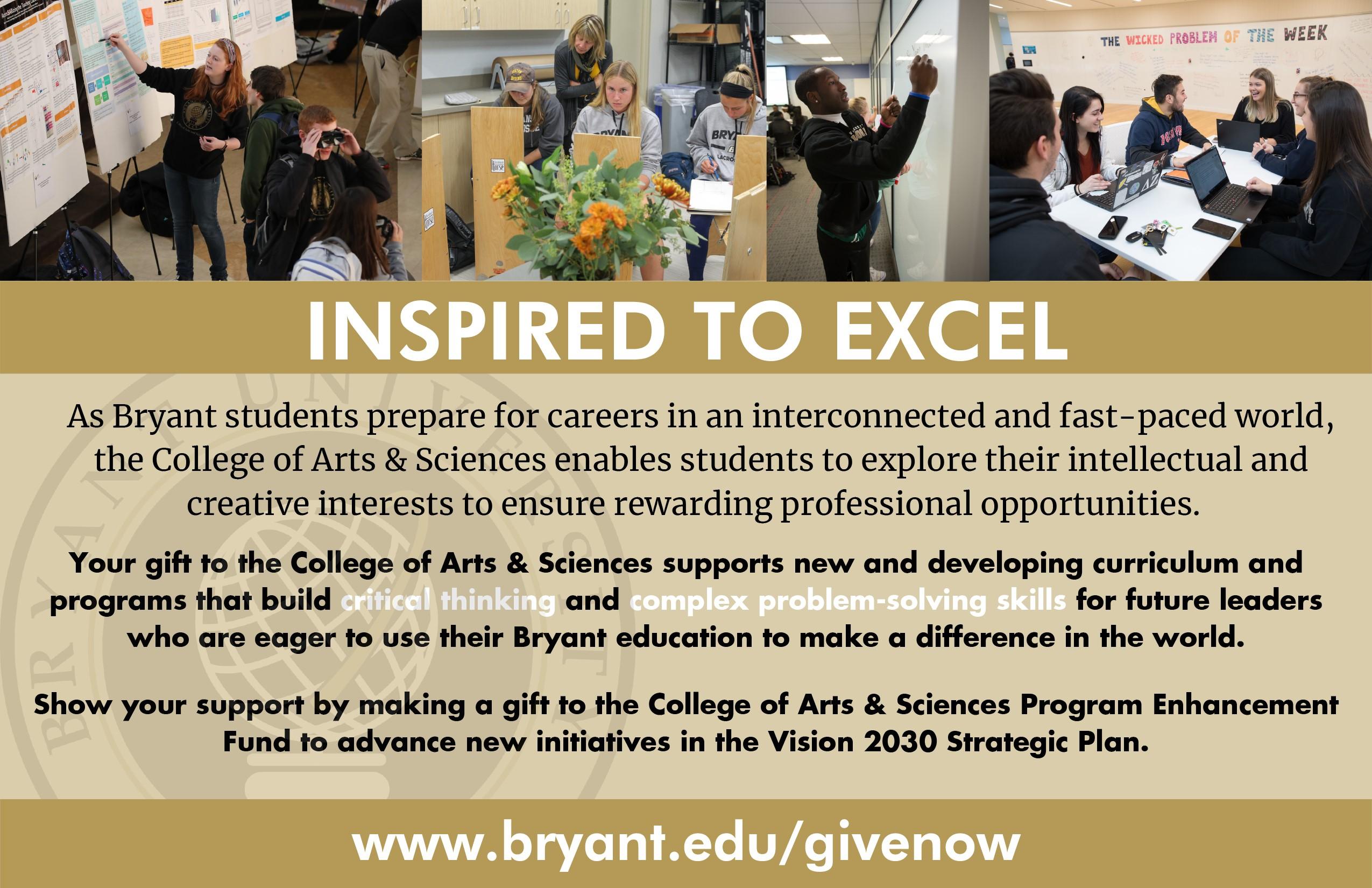 Bryant’s academic excellence ecosystem is designed to invigorate intellectual curiosity and create globally minded and empathetic citizens who are innovative, analytical thinkers and purposeful, passionate leaders. Our unique interdisciplinary curriculum prepare graduates for careers and rewarding lives in a world of everaccelerating technological change and convergence.