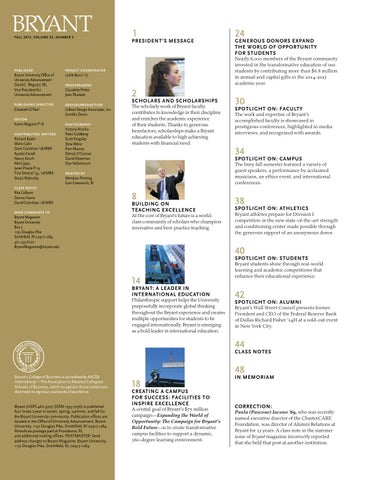 Bryant (USPS 462-970) (ISSN 1935-7036) is published four times a year in winter, spring, summer, and fall for the Bryant University community. Publication offices are located in the Office of University Advancement, Bryant University, 1150 Douglas Pike, Smithfield, RI 02917-1284. Periodicals postage paid at Providence, RI, and additional mailing offices. POSTMASTER: Send address changes to Bryant Magazine, Bryant University, 1150 Douglas Pike, Smithfield, RI, 02917-1284.