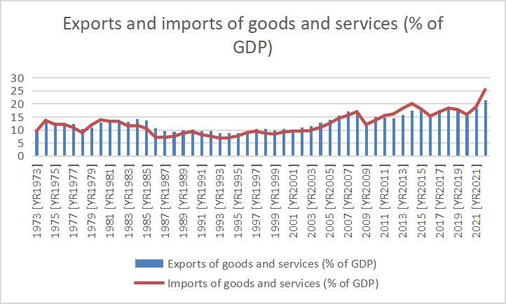 Figure 4: Exports and imports of goods and services (% of GDP)
