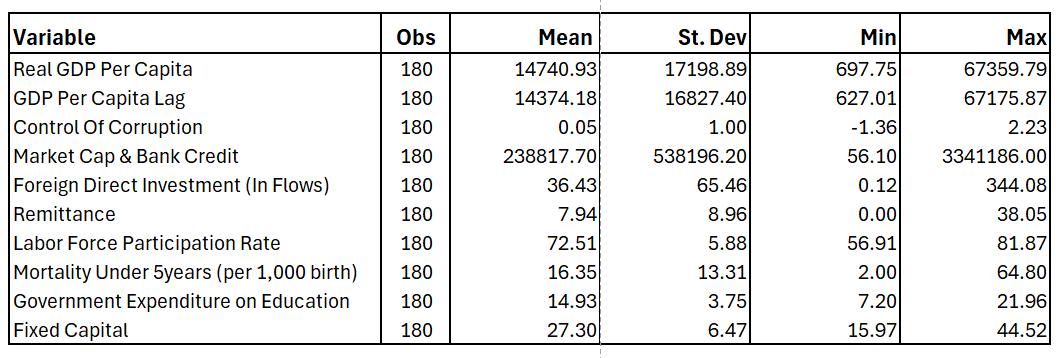 GDP Growth=β0+β1(Aging population)-β2(Exports of goods and services)+β3(Imports of goods and services)+β4(Unemployment)-β5(Inflation)+β6(Gross domestic savings)-β7(Gross national expenditure)+β8(Merchandise trade)-β9(FDI)-β10(Domestic credit)+β11(Stock trade)+ϵ