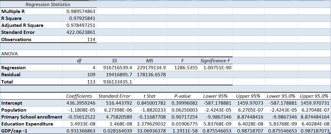 Coefficients Standard Error t Stat P-value Lower 95% Upper 95% Intercept 0 #N/A #N/A #N/A #N/A #N/A Population ages 65 and above 0.377639882 0.218715723 1.726624299 0.092149676 -0.064754425 0.820034189 Domestic credit to private sector -0.06592554 0.019399687 -3.398278507 0.00157453 -0.105165112 -0.026685969 Exports of goods and services -0.90955762 0.667233155 -1.363178093 0.180645036 -2.259164063 0.440048824 Imports of goods and services 1.607455679 0.622767557 2.581148715 0.013722795 0.347789397 2.867121961 Foreign direct investment, net inflows -2.977725162 1.379413762 -2.158688889 0.037088047 -5.767852854 -0.18759747 Gross domestic savings 1.361965277 0.35189138 3.870413867 0.000402614 0.650197778 2.073732776 Inflation, GDP deflator -0.61883626 0.137967931 -4.485363038 6.25496E-05 -0.897902742 -0.339769778 Gross national expenditure -0.403284216 0.142599055 -2.828098805 0.007355276 -0.69171803 -0.114850403 Stocks traded, total value 0.008449065 0.0127386 0.663264821 0.511062623 -0.017317185 0.034215316 Merchandise trade -0.264027921 0.57437324 -0.459680052 0.648298222 -1.425807459 0.897751617 Unemployment, total 1.21461245 0.714267618 1.700500511 0.096999279 -0.230130176 2.659355075 Empirical Economic Bulletin, Vol. 17 272