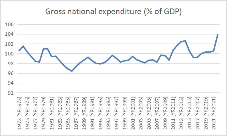 Figure V shows the change in the share of net national consumption. As can be seen from the graph, the net national consumption share fell sharply in 1987, then roughly stabilized between 100 and 98, and increased significantly around 2010.
