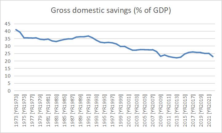 Figure 4 shows the change in Japan's net national saving share. As can be seen from the figure, before 1990, Japan's national net savings ratio basically hovered around 35%. After 1990, the proportion of savings in Japan showed a gradual decline.