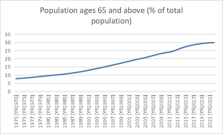 Figure 2 shows the changes in Japan's aging population between 1973 and 2022. The Y-axis shows the percentage of Japanese over the age of 65. We can see that the aging rate of Japan's population has been on the rise for the past 50 years, which is a major reason for Japan's slow economic growth.