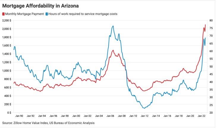 Arizona's housing market faces significant challenges, with rising interest rates leading to the highest home buying costs since 2007, requiring households to work approximately 68.72 hours per month to service mortgages, nearly double the requirements from September 2020. Despite a
