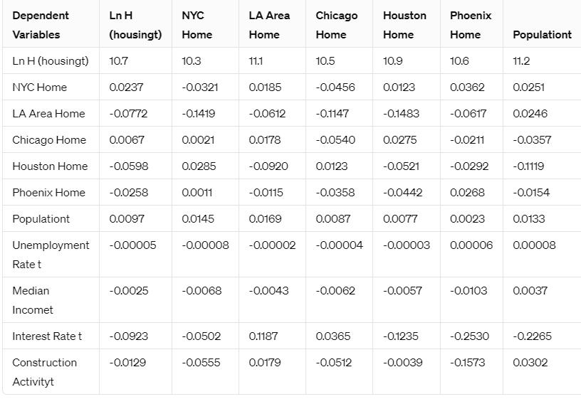 Interest Rate t exhibits a substantial decrease from 0.1187 to -0.0923, suggesting a significant negative impact on housing market trends due to lower interest rates. LA Area Home experiences a decline from -0.0612 to -0.0772, indicating a decrease in housing area activity in Los Angeles. Median Incomet shows a reduction from -0.0043 to -0.0025, suggesting a potential decrease in median income levels affecting the housing market dynamics.