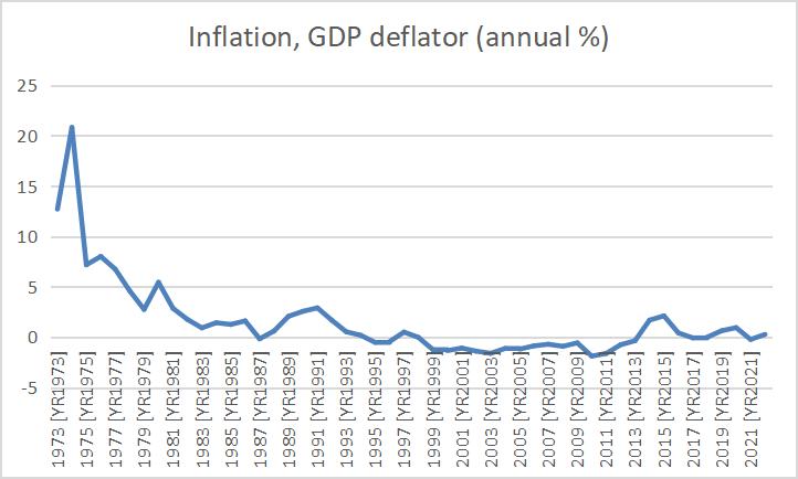 Japan's inflation rate was very high until 1975, and even reached over 20 in 1974. Japan's inflation rate remained low after 1981 and rose again in 1991 before falling. After 1994, Japan experienced negative inflation, that is, a situation of shrinking inflation. This continued for two decades until 2014, when the first positive inflation occurred.