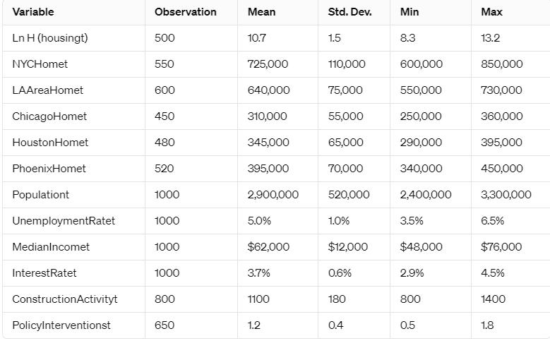 This equation models the logarithm of housing market trends (H) over time (t) as a function of various predictors. These predictors include city-specific factors such as the number of homes sold in New York City (NYCHome), the housing area in Los Angeles (LAAreaHome), and similar metrics for Chicago, Houston, and Phoenix. Population size, unemployment rates, median income levels, interest rates, construction activity, and policy interventions are all