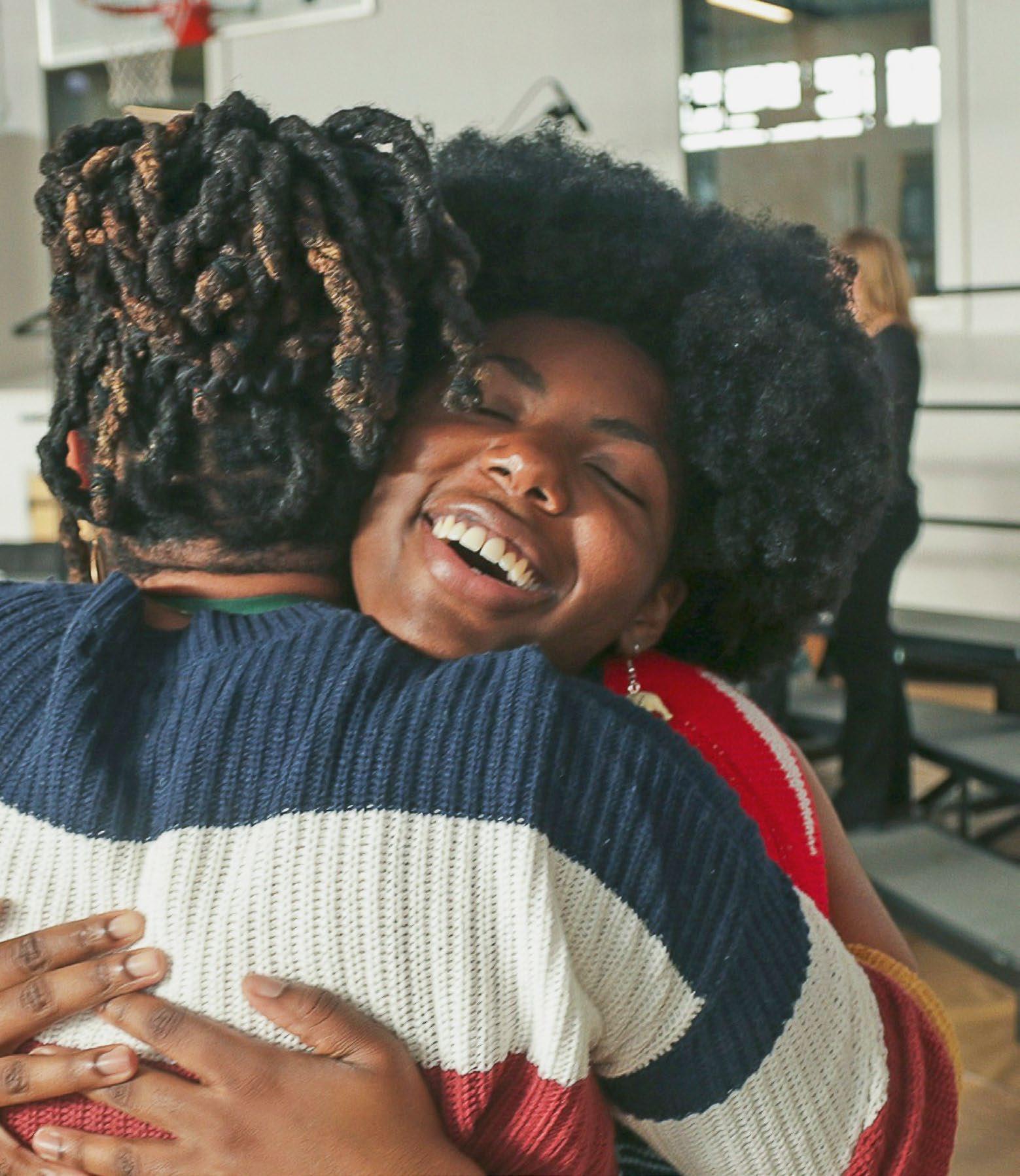 4. Zavier Richardson ’24 is welcomed back to Bryn Mawr by Associate Director of College Counseling Shanae Giles after Convocation last November.