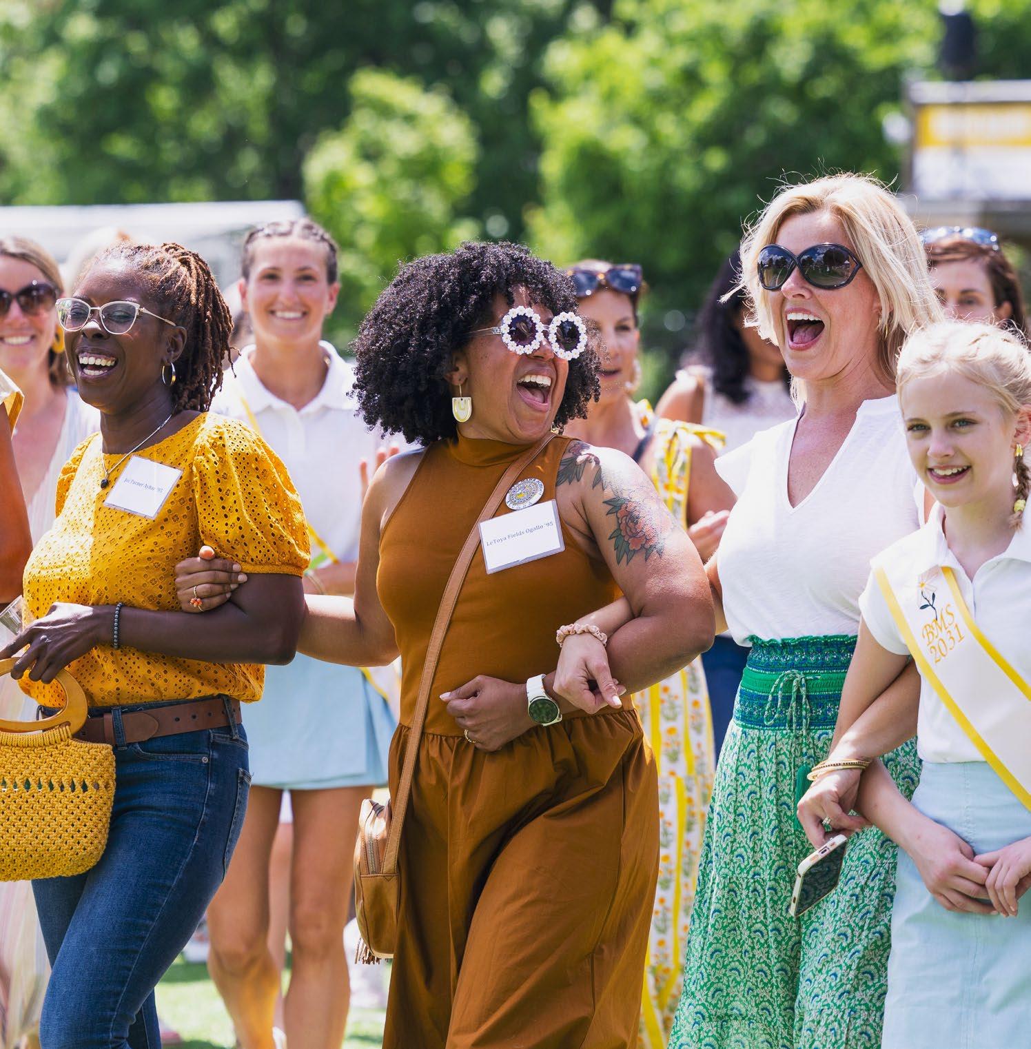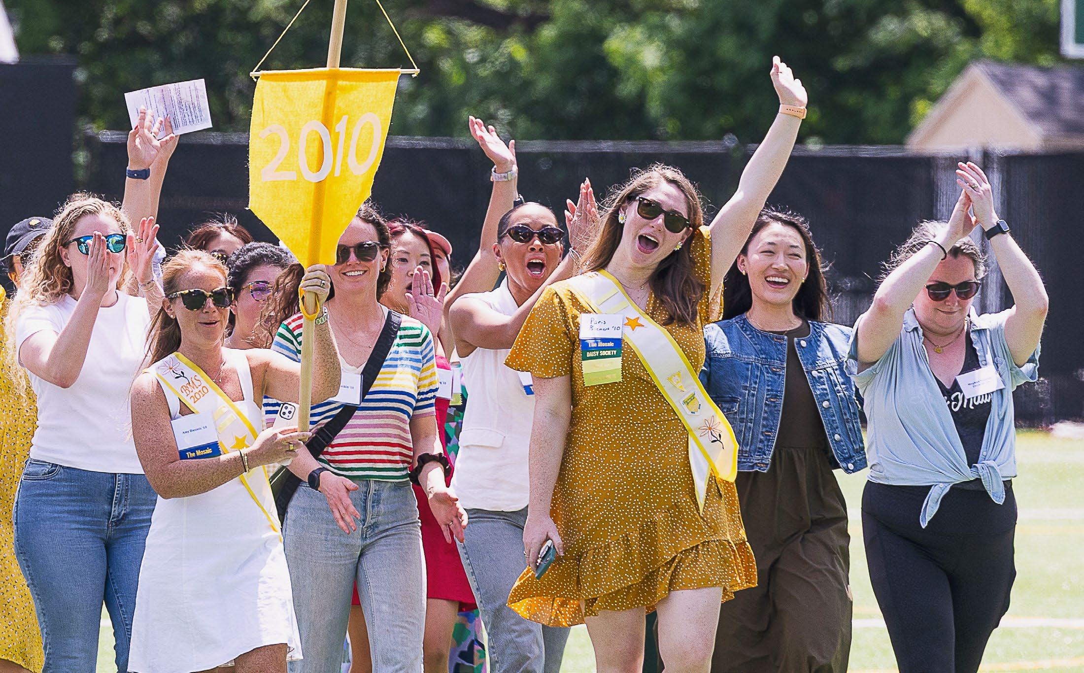 5. Joi Turner Aybar ’95, Toya Fields Ogallo ’95, Mandy German Fine ’95, P’31 and daughter Madeline Fine ’31 link arms in the Class of 1995 Banner March.