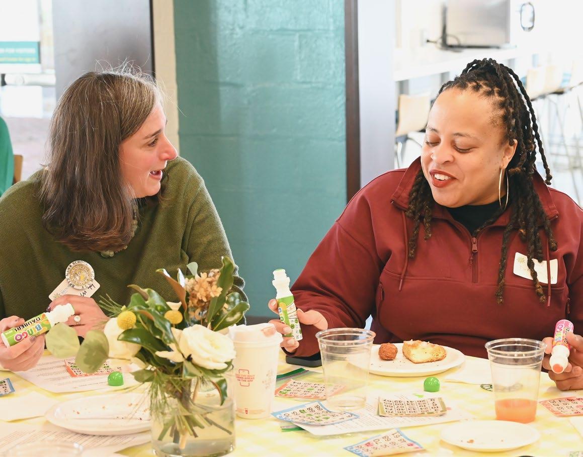 8. Classmates Jen Sullam ’99 and Derrica McCullers Lane ’99 catch up at the Alumnae Bingo Brunch.