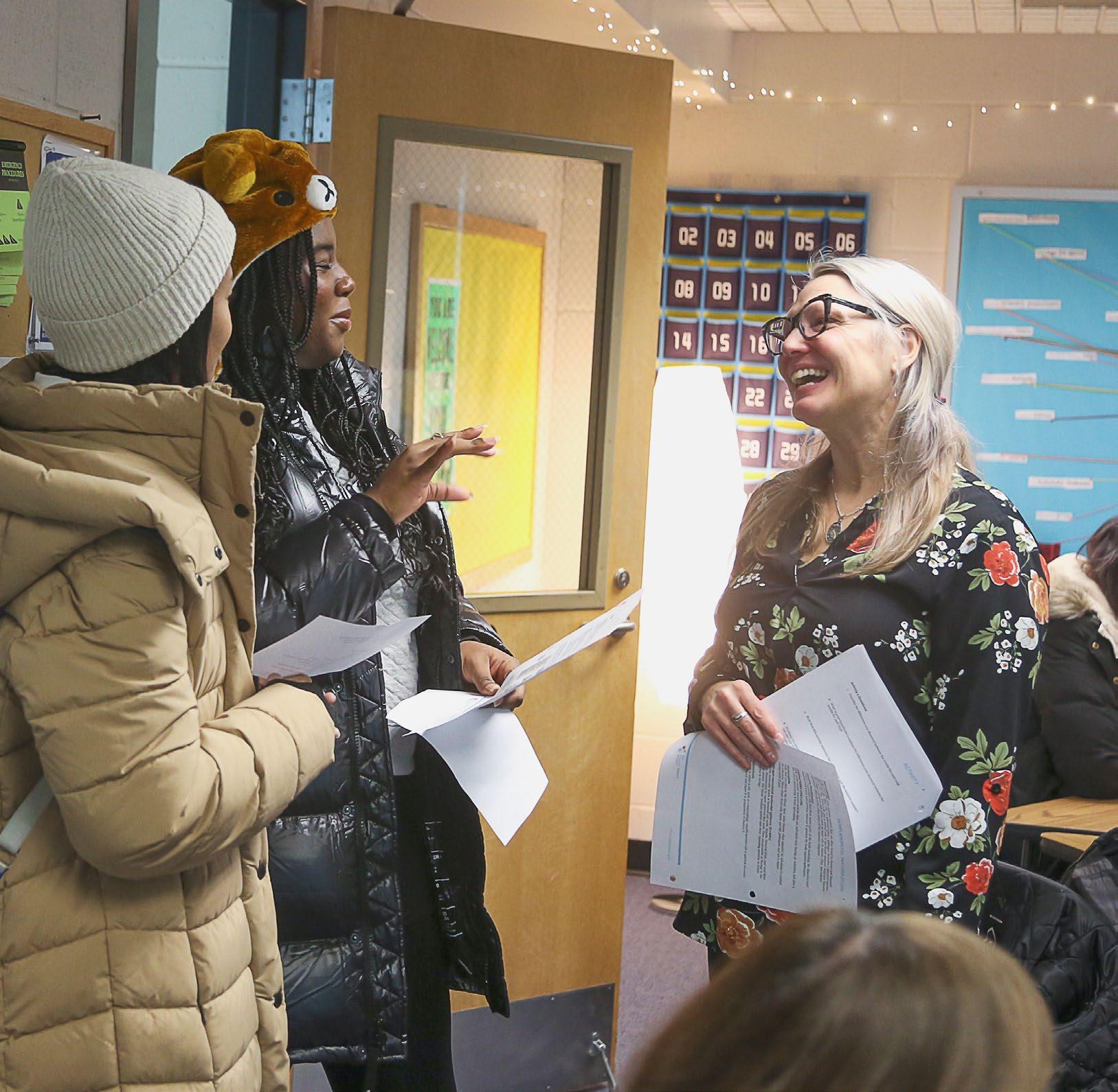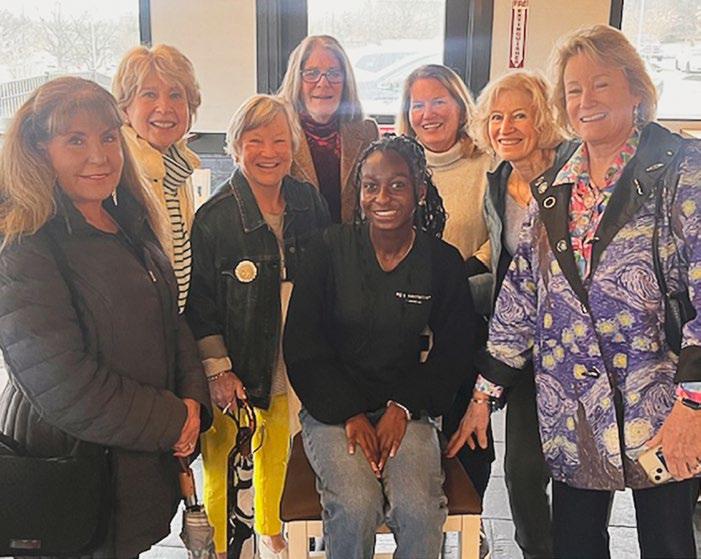 5. Cadence Cherot ’24 and McKenzie Tebo ’24 catch up with Upper School Science Teacher Dr. Sasha Klevytska at the annual Alumnae Come Back to School Day in January.