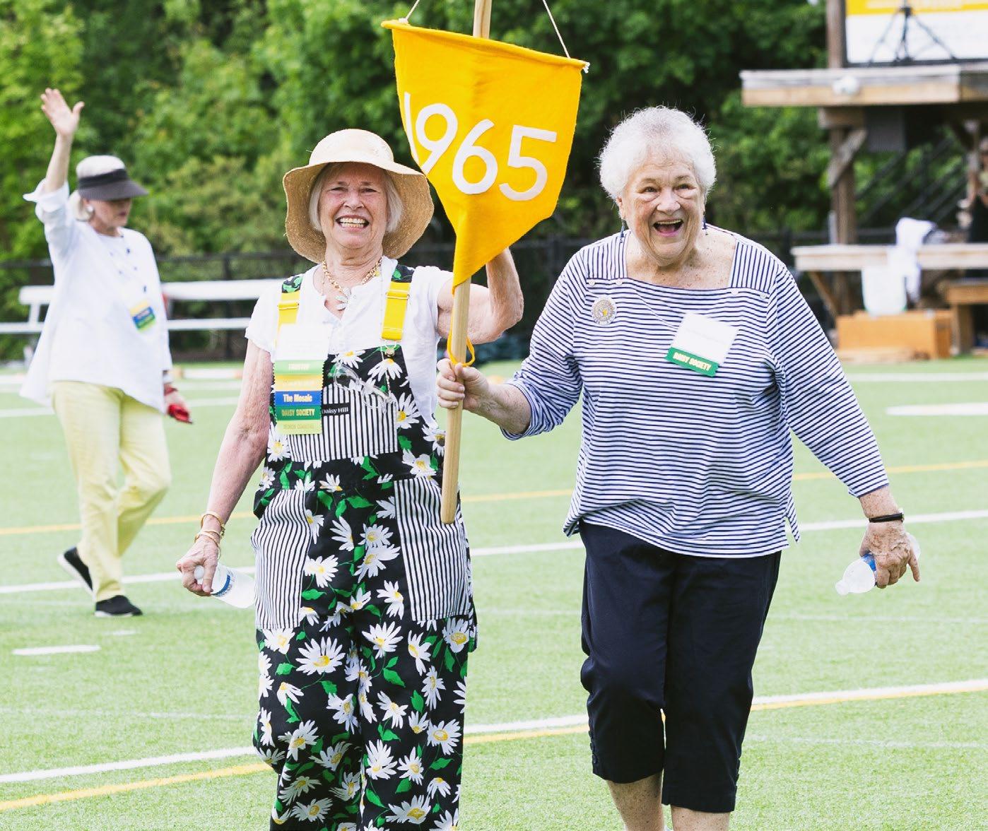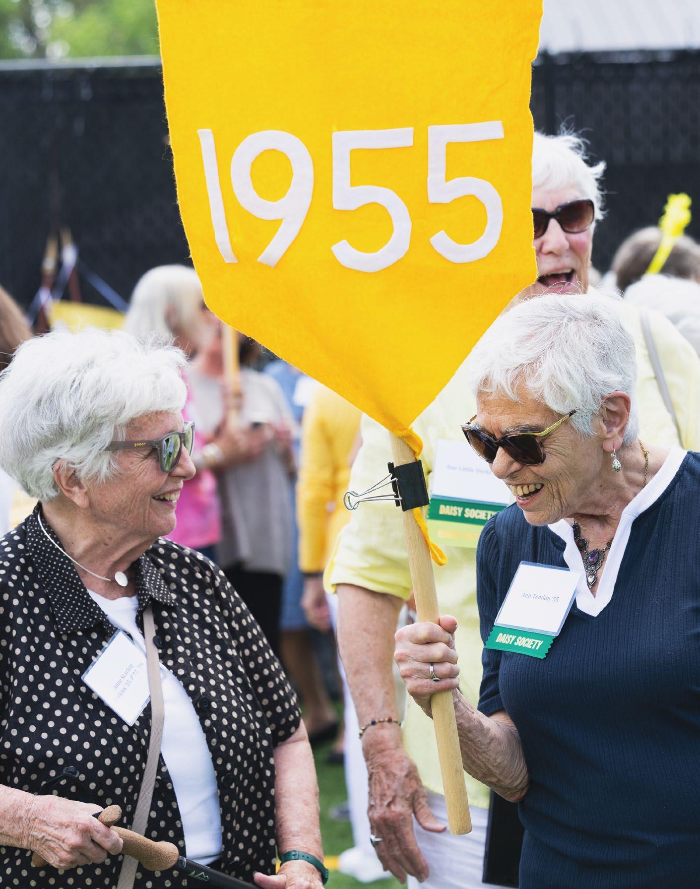1. Anne Scarlett Perkins ’55, P’77 ’79 (left), Ann Temkin ’55 (right), along with Sue Little Diehl ’55 before the Banner March.