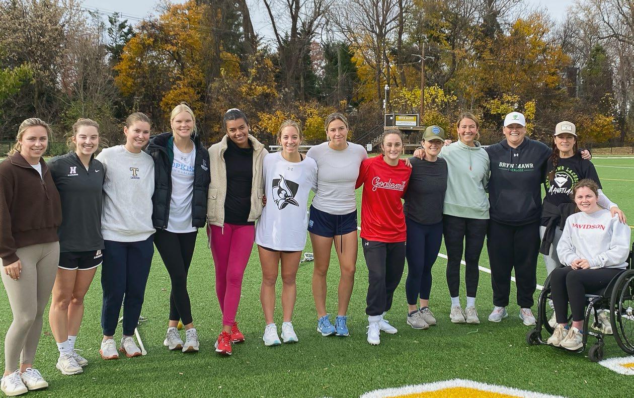From the Bryn Mawr field to higher ed—Rachel Dye ’24 (left) and Bianca Hessler ’24 (right) reunited for a field hockey game.