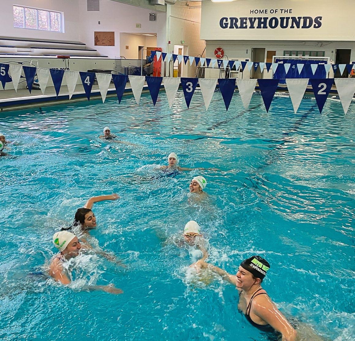 6. Alumnae swimmers join the current team for a friendly game of water polo over winter break at Gilman School’s pool.