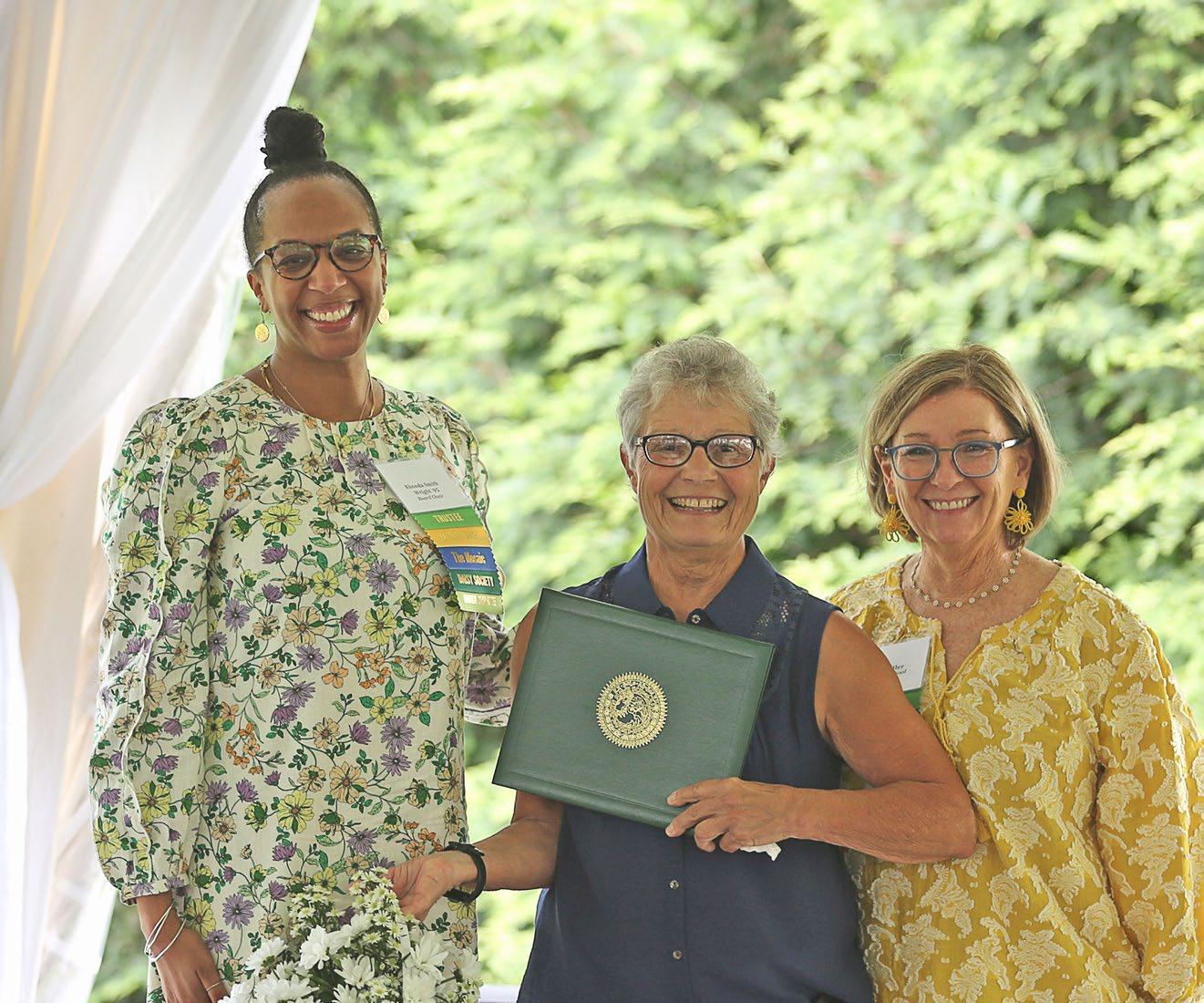 8. Terry Detorie is all smiles after receiving her honorary alumna diploma from Board Chair Rhonda Smith Wright ’95 and Head of School Sue Sadler.