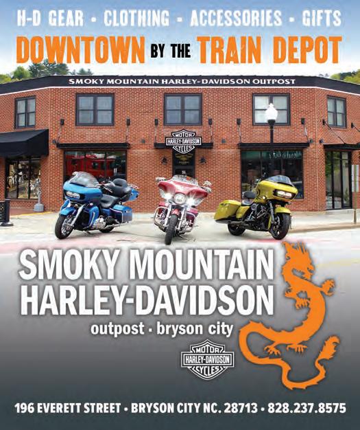 On Fontana Lake Family Owned for 50 Years • Pontoon Rentals • Lakefront Cabins • RV Park ALMONDBOATPARK.COM • 828-488-6423 1165 Almond Boat Park Road • Bryson City RIDING STABLES • Experienced Guides • Well-Trained Horses • Ages 5 years and Up • Groups Welcome Call for Rates and Availability! Cherokee, NC 28719 828.497.2373 smokemontridingstable.com Wagon rides available for all ages. Basic instruction and tips on horseback trail riding are given before each ride 1 Hour Ride Features crossing of the Oconaluftee River 2 ½ Hour Ride Features cascading waterfall 4 Hour Ride Features river and waterfall views