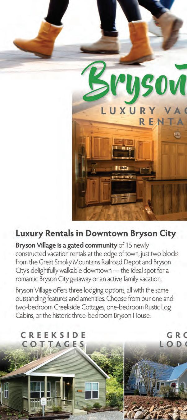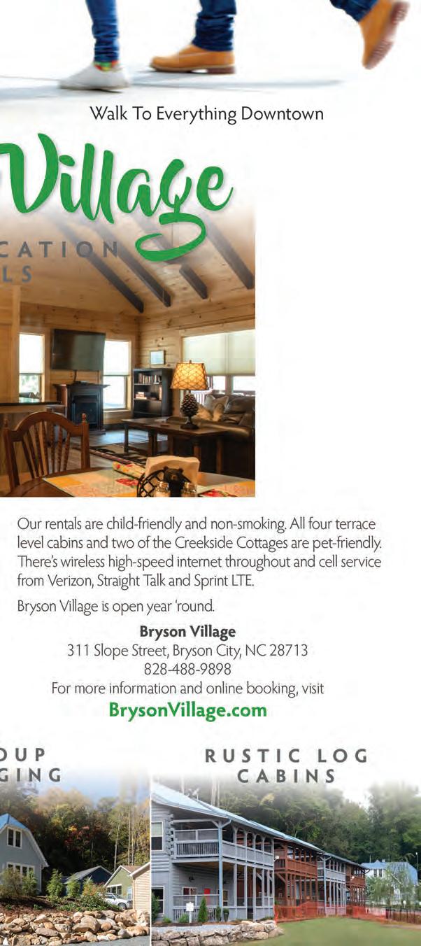 BETWEEN BRYSON CITY & CHEROKEE ON HWY. 19 Central to Great Smoky Mountains Railroad, the National Park, unlimited family attractions and unbelievable scenery! TWO RIVERS OPEN YEAR-ROUND WITH OFF-SEASON SPECIALS 5280 Ela Road, Bryson City • (828)488-2284 www.TwoRiversLodgeNC.com LODGE & CABIN Bryson City • 888.472.3862 • Rafta ndZip.com LLIVE ADVVENTURE WIILLDDWAATTEER R N NAANNTTAAHAALA A Smoky Mountain Meadows Campground smokymtnmeadows.com | 828-488-3672 755 East Alarka Rd. Bryson City, NC When you enter our campground, you can leave all the "rush-rush" of your daily life behind. You will find yourself in a beautiful valley with quiet green meadows and a bubbling brook encompassing your surroundings.
