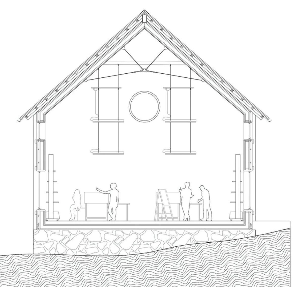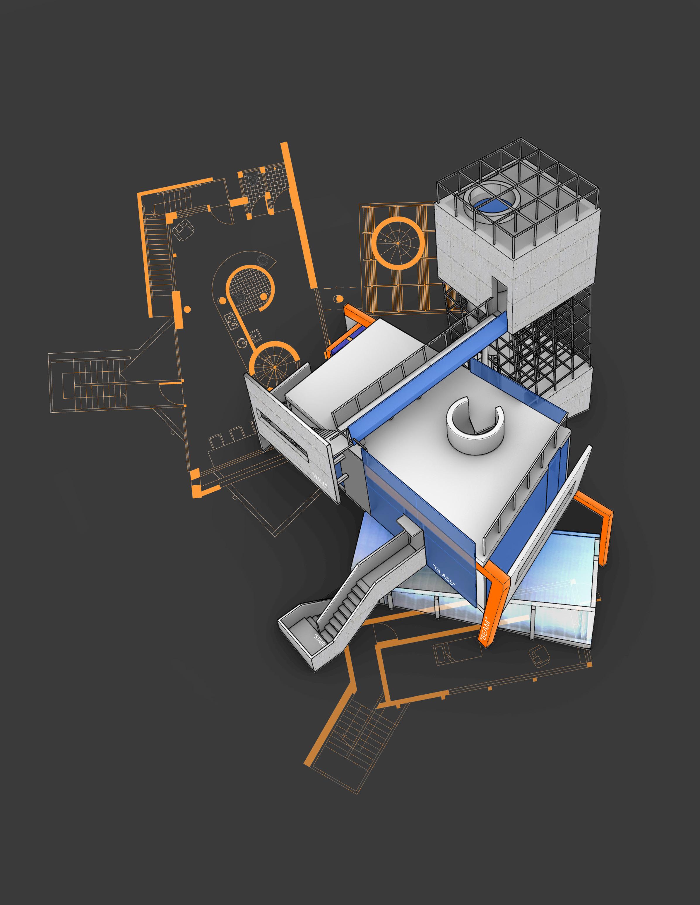The house becomes a constant work in progress, the client always on the move, working as a constant exhibition of creativity and fluid movement, deconstructed as a process through structure, program, materiality and circulation - using Virgil’s idea of “1 idea and repetition to own it” - achieved by inverting beams, walls, glass and exposing scaffolding.