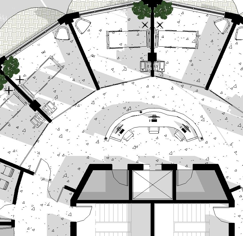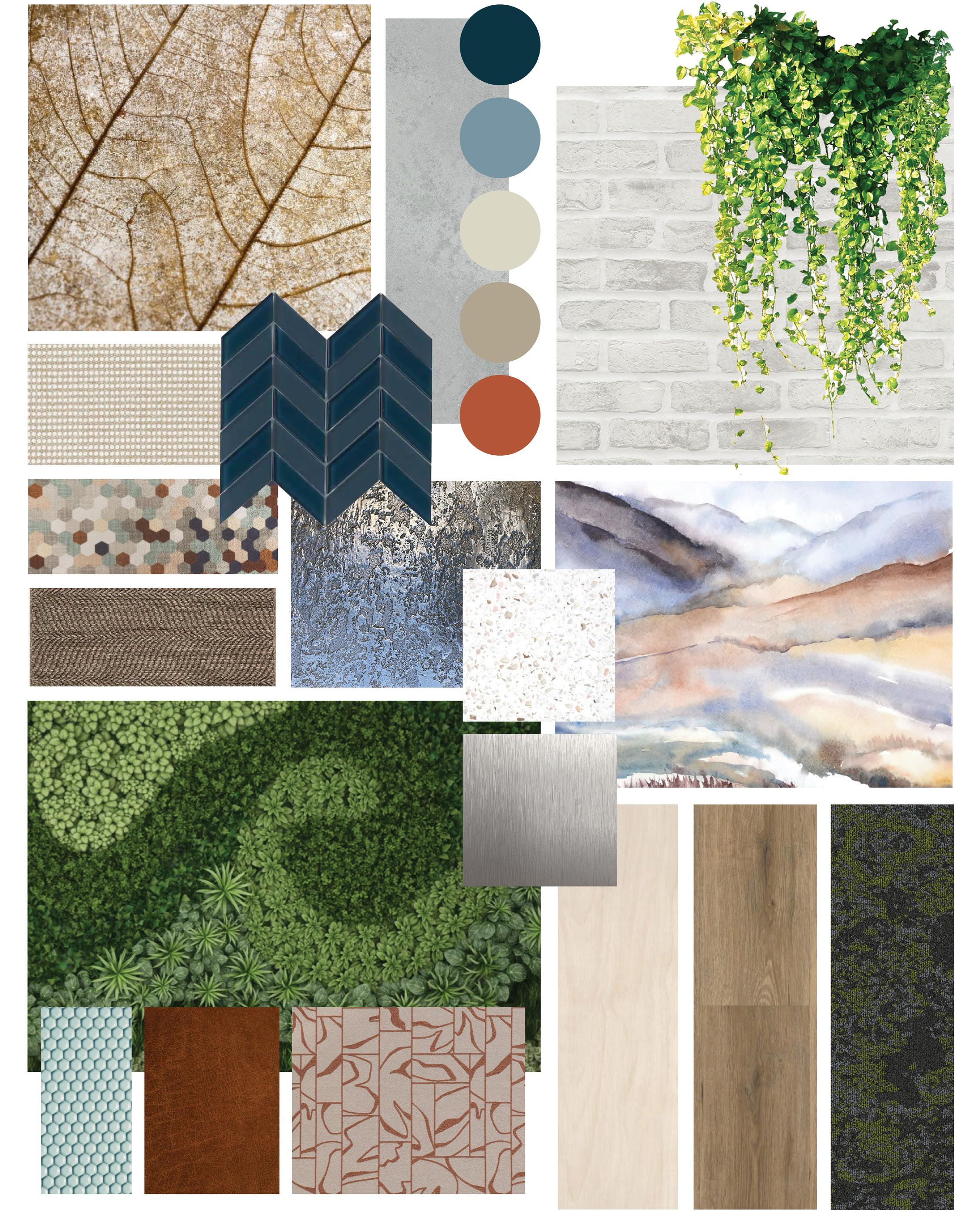 The facility I designed combines affordable housing, healthcare, and public amenities for post-incarcerated people, using biophilic and sensory design theory. The adapted Radisson hotel made for the perfect site for this extensive program. About half of the facility is private due to the affordable housing section of the skyscraper, the other half is split between semi-private and public spaces. Many with a previous record are exempt from public housing and benefits and would greatly appreciate living somewhere that has public amenities included. The public spaces are located at the base of the building while the private housing is at the top of the tower. Situated between the two are the majority of the semi-private program. The vertical circulation takes place within the existing building core. While the building is mostly made up of interior spaces, the proposed facility also boasts two large terraces and ample amounts of green roofing. The addition of green roofing and an automatic irrigation system softens the existing concrete exterior as well as boosts the overall sustainability of the building. Moreover, the materiality within the reimagined halfway home is heavily inspired by sustainability, nature, and multi-sensory features. My initial pattern studies look at natural forms and patterns through a variety of transformations. The patterns were also influenced by the existing building shell and its floral, organic shape. While the existing spatial organization resembles a symmetrical, webbed layout. The waves, veined, and honeycomb patterns can be seen within my proposed spatial organization, materiality, acoustics, and selected furniture.