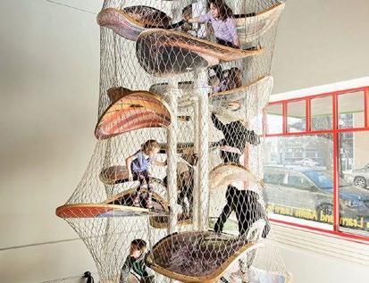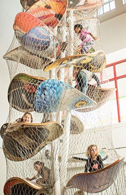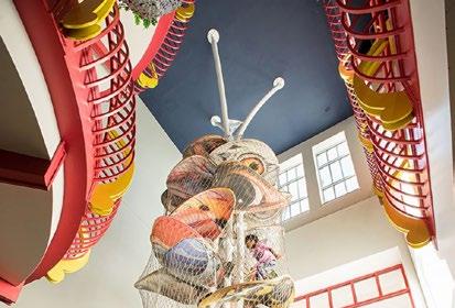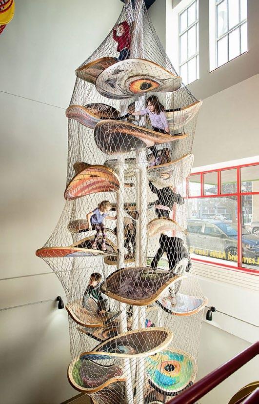 the children’s museum of la crosse features a playful climbing sculpture that can be used by children. the sculptural piece is described as having “vibrant peering eyes speckled, spotted, striped and scaled looking up and down” the materials used in this project are bent plywood, molded plastic, and steel pipes.luckey llc is a bespoke design-build firm who are popular for their sculptures known as luckey climbers. the structures help to define public spaces and create emblematic play areas. the users of the space find a place to be adventurous, think spatially, and learn to problem solve. the sculpture also allows children to be “kids with other kids”.