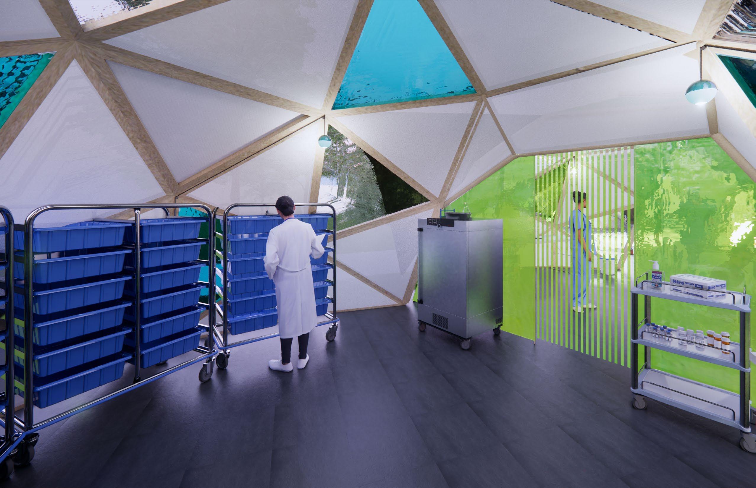 “how could a layered interior environment entice, comfort, and await users in a pop-up clinic space?”