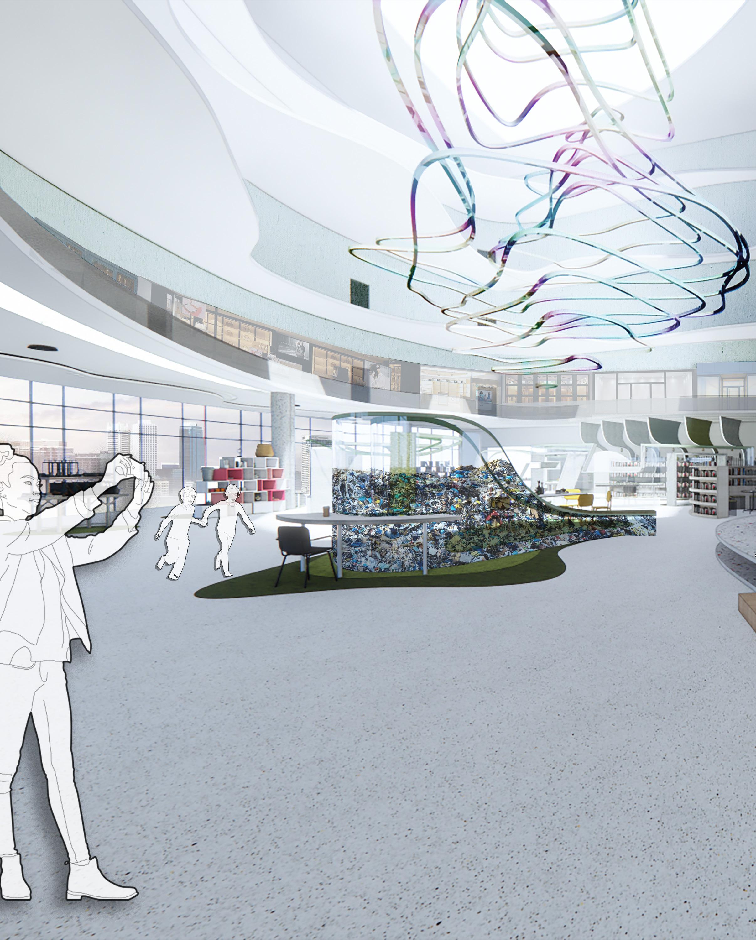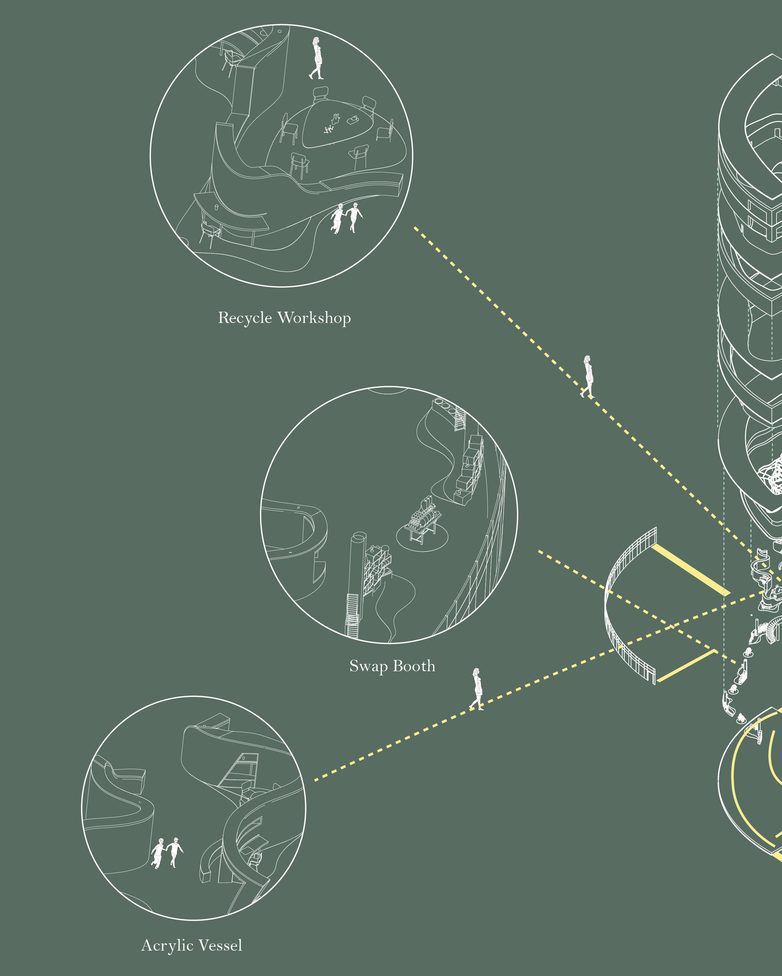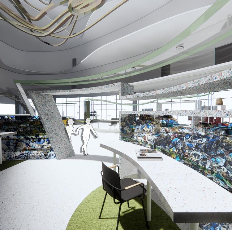 “The central acrylic vessel is the heart of the community, where you can drop off your plastic waste and start working on your ideas at the workshop.”