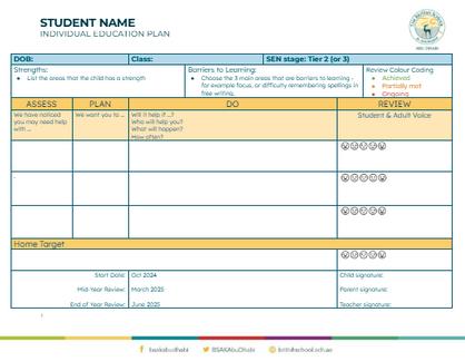 An Individual Education Plan (IEP) is a more detailed, personalised plan designed for children with identified and often more complex special educational needs. IEPs include specific learning targets, agreed strategies, and any interventions or specialist input being provided These plans are developed collaboratively with input from class teachers, Inclusion staff, external professionals (if applicable), and parents. The IEP helps to ensure that everyone involved in supporting the child is working towards clear and consistent goals