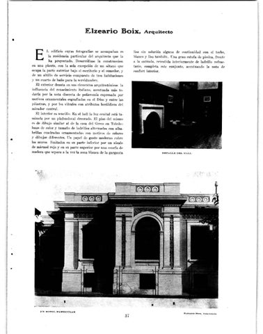 la residencia particular d el arquitecto que la ha proyectado. D esarróHase la constrnccion en una planta, con la sola excepción de un sótano que ocupa la parte anterior bajo el escritorio y el comedor, y de un altillo de servicio compuesto de tres habitaciones y un cuarto de baño para la scrvidumhre. El exterior denota en sus elementos arquitectónicos la influencia del renacimiento ital icmo, acentuada más todavía por la nota discreta de policromía expresada por motivos ornamentales esgrafiados en el friso y entre las pilastras, y por los vitrales con atributos heráldicos del mirador central. El interior es sencillo. En el hall la luz cenital está tamizada. p or un plafondoval decorado. El piso d el mi~mo r~ de dibujo s imilar al de la casa del Grf"Co en 'roledo: losas de color y tamaño de ladrillos altt>•·nada¡;; con alhabrillas cuadradas ornamentada~ con motivo!'i d e colores y dihujos diferentes. lTn papel d e gusto moderno eub rc los muros limitados en sn parte inferior por un zócalo de mármol r ojo y en su parte superior por una cenefa de madera lftte separa a la vez la zona blanca d e la garga n ta