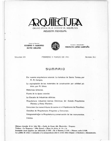 • Oficinas: Aveni.d a !8 de Julio 953.- Casilla de Correo 484. Montevideo - Uruguay. Teléfono « La Urugu_a ya ) 1394, Central.- Horas de oficina de 14 a 16. Suscripción anual pagadera por adelantado, $ 3.00.- En el Exterior, $ 3.50.- Número suelto $ 0.50. Los pedidos de a visos y suscripción y la correspondencia sobre la revista deben dirigirse al Secretario y Administrador•