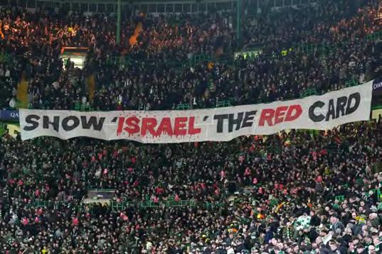 During a Champions League knockout match against Bayern Munich, Celtic fans displayed a bannercallingforIsrael’ssuspensionfromfootball, riskingUEFAsanctions.Theclubpreviouslyfaceda £15,000finein2023forasimilarprotest.