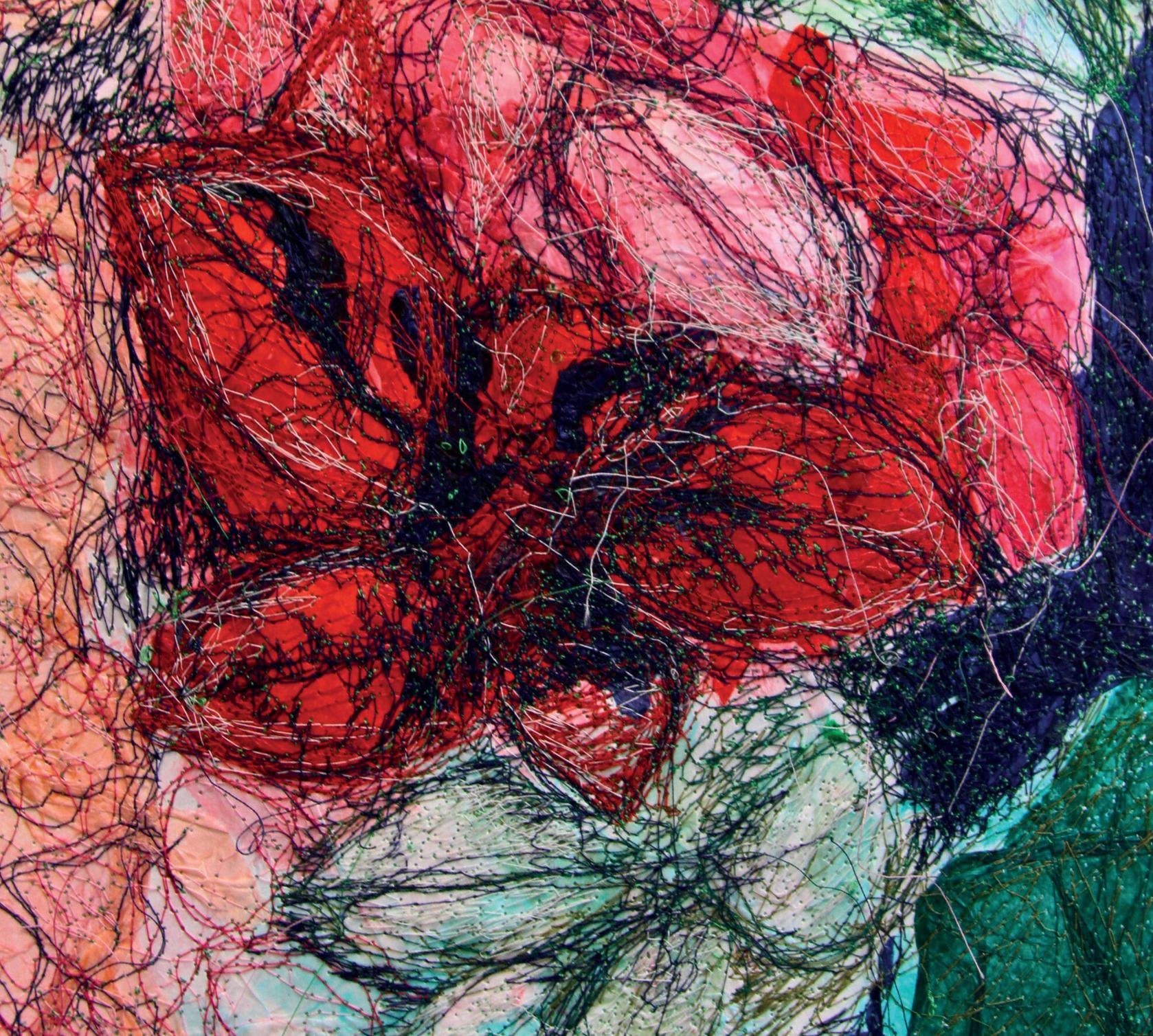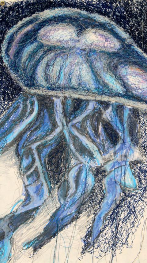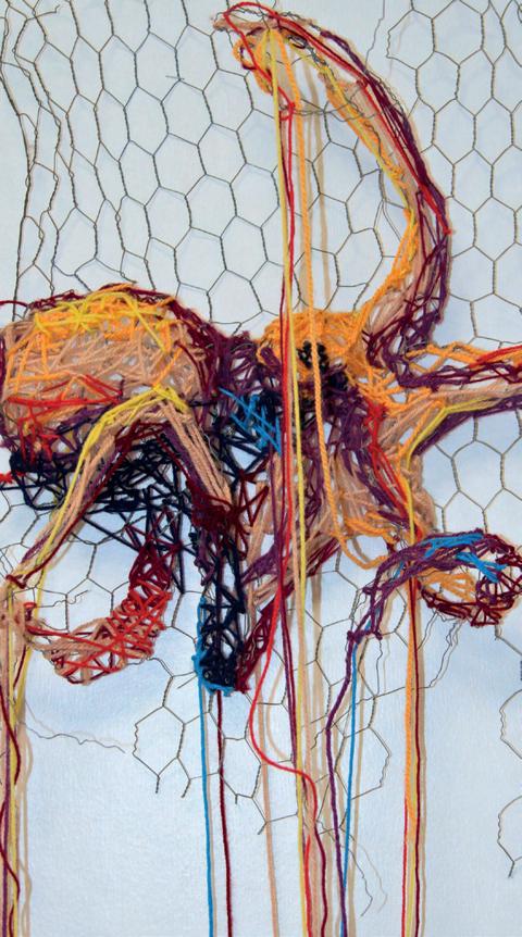 My body of work revolves around the feeling of being ‘submerged,’ creating an underwater world through mixed media. By combining fabrics, prints, wire, and oil pastels, I evoke an oceanic atmosphere. Inspired by Anni Albers’ modernised ancient weaving and the use of recycled materials, I delve into the concepts of textile art.