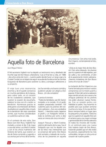 El fiel secretario Viglietti nos ha dejado un testimonio vivo y detallado del triunfal viaje de Don Bosco a Barcelona. Casi al final de su vida, en 1886 --dos años antes de morir--, nuestro padre decide hacer un largo viaje a la Ciudad Condal con el objeto de seguir recaudando fondos entre las familias burguesas de Barcelona para sostener su obra y conseguir adhesiones a su proyecto. El viaje tuvo unas resonancias enormes y de él quedó constancia en muchos periódicos de la época, pero sobre todo, en el corazón de los ciudadanos catalanes, que tuvieron la ocasión de escucharlo, celebrar la misa con él o recibir su bendición. Numerosas gracias se atribuyeron a la intercesión de María Auxiliadora en aquellos días a través de la bendición del viejo sacerdote turinés, que muchos consideraban un auténtico santo en vida. En el contexto de esta visita, Don Bosco (con Don Rúa y Viglietti) fue invitado a comer el día 3 de mayo a casa del señor Luis Martí-Codolar y con él los chicos huérfanos del Oratorio de Sarriá, que vivieron un día de fiesta corriendo y jugando a sus anchas por la finca de la familia.
