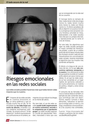 mejante a lo que inducen las drogas en la mente del adicto. Por otro lado, el uso de redes sociales puede incidir negativamente en nuestra autoestima, asociada a la competencia por la aprobación grupal. Las redes sociales exponen