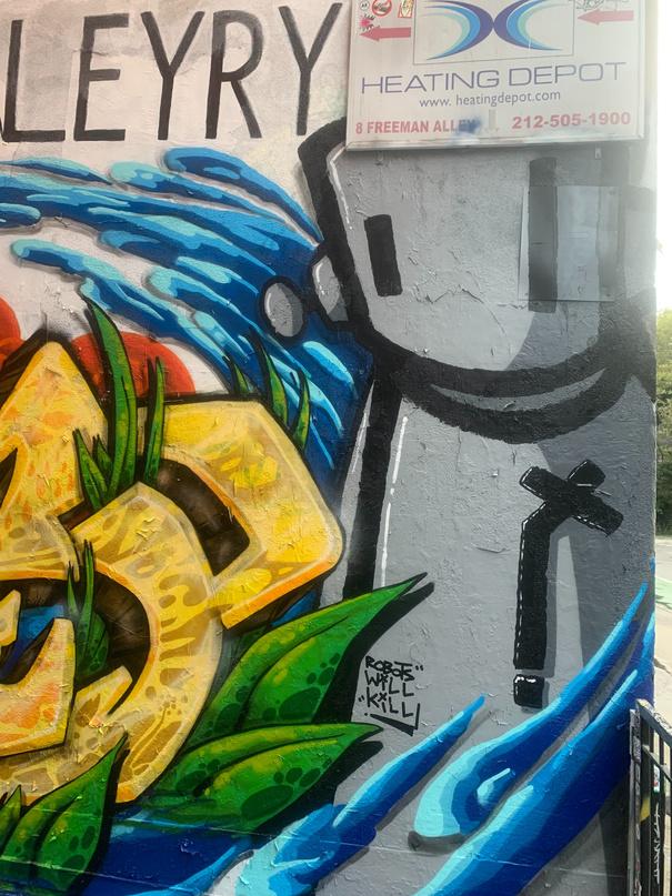 One wall of Freeman Alley has been curated since July as the Alleyry (Get it? It’s at once an alley and a gallery) by the well-known street artist Vewer. So far three major mural installations and at least one show of hanging art have been staged. Participants have included some of the biggest names in today’s NYC street art scene: 2esae, Dred, Belowkey, Degrupo, Abe, Eyesticker, Vers, ChrisRwk, Avery, Moody, Love Notes and more.