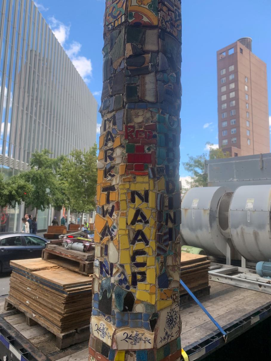 Long-time EV resident Jim Power has spent some 40 years installing and maintaining a trail of colorful mosaics on poles, planters, sidewalks and curbs along St. Marks Place from Astor Place to Ave. A. And at 75, Power is still going strong. On a lovely recent Sunday afternoon, he was working on a mosaic on the curb at St. Marks and 1st Ave., sipping his favorite Red Bull and chatting with passersby as he worked. His little red scooter stood nearby. “I love this neighborhood and I always will. That’s why I try to do my bit to make it a little more beautiful. I want it to keep its artistic flair,” he said. In 2004, Power received an official thank you from the city in the form of a proclamation by Mayor Michael Bloomberg that credited him with “beautifying the city with distinctive, artful mosaics.” And he was granted permission to continue placing mosaics on public property. Born in Ireland, Power moved to the neighborhood in 1981 living near the old Fillmore East on Second Ave. at 6th St., working as a carpenter. It was shortly thereafter that he began the Mosaic Trail, the work that would consume him for the next four decades. He supports himself through commission work, selling artworks including beautiful mosaic belt buckles like the one he's holding on the cover of this mag, and donations via Venmo at James-Power-36.