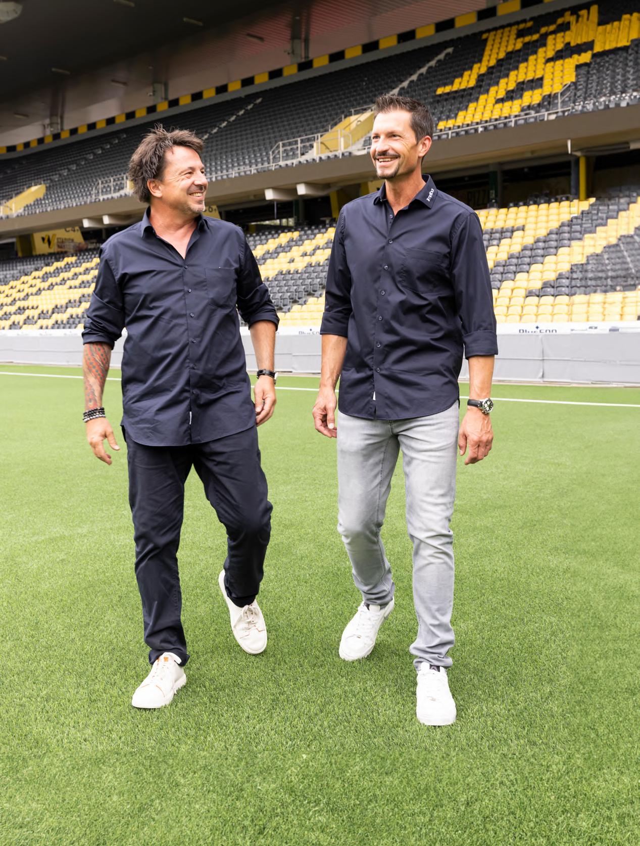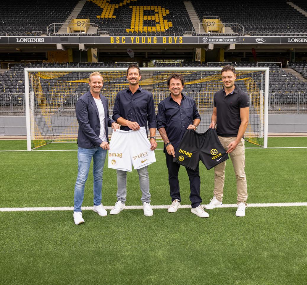 Firmengründer Beat Fahrni und CEO Cristian Cescon stehen auf dem Kunstrasen im Wankdorf und präsentieren nicht ohne Stolz die neuen YB-Hosen mit den Logos ihrer Firmen. Bei den Heimspielen auf den schwarzen Hosen steht Komit und auswärts auf den weissen Shorts TimeTool. YBusiness-Fotograf Remo Neuhaus setzt die beiden Macher gekonnt in Szene. «Das macht richtig Spass», sagt Fahrni mit seinem ansteckenden Lachen. «Remo weiss genau, wie er uns fotografieren muss, er hat nach wenigen Sekunden gemerkt, wie wir am besten aussehen!»