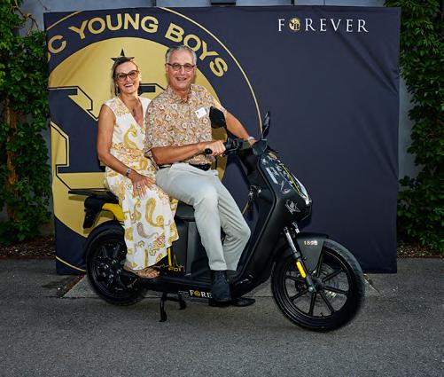 Hans Wirz (Wirz Unternehmungen) und Ehefrau Ariane ersteigerten einen YB-Roller zugunsten der Youth Base.