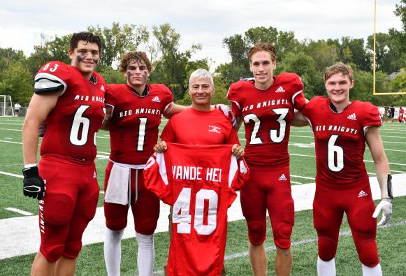 During his homecoming visit, Vande Hei attended an alumni gathering to reconnect with classmates and shared memories about their time at BSM. The bonds created nearly forty years ago were still strong, affirming that the “once a Red Knight, always a Red Knight” slogan rings true. Vande Hei was also honored during half-time at the homecoming football game. “I think sports are a really good way to take