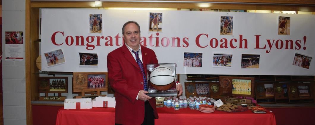 CELEBRATION – John Moore ’74 was honored for his successful basketball coaching career on December 17. During his 24-year career, coach Moore led the Red Knights to 408 career wins, one state championship, and multiple conference and section championships. In the photo, Coach Moore accepts a basketball from Athletic Director Jerry Pettinger.